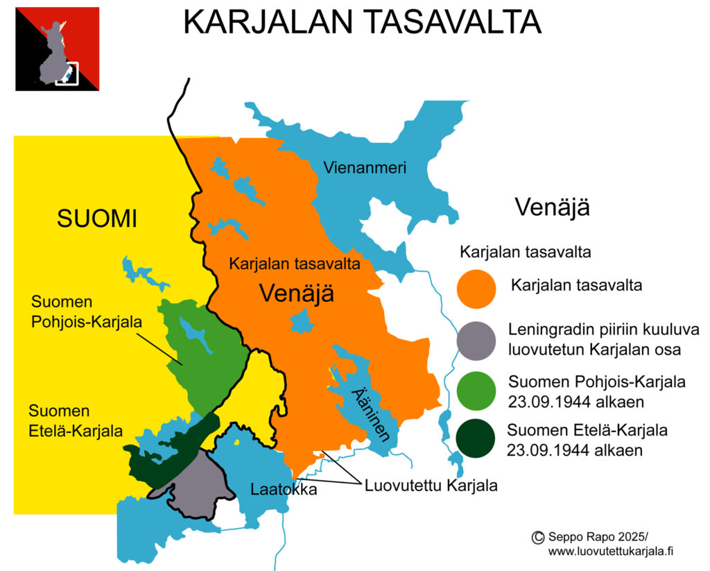 Karjalan tasavalta Luovutettu Karjala sijaitsee osittain Venäjän Federaation Karjalan tasavallassa ja osittain Venäjän Leningradin oblastissa (Leningradin piirissä).
