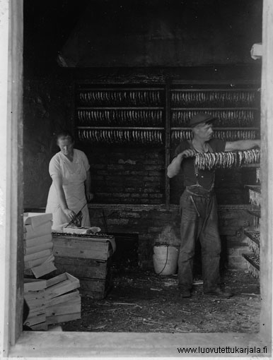 Viimeinen kuva Toivo Kyytisen talosta Kurkijoen Särkijärven kylästä. Perunoita on nostettu syksyllä 1944. Miehet Mikko Poutanen ja Toivo Kyytinen nostavat laatikoita Ahon asemalle vietäväksi. Vas. naiset Elsa Poutanen ja Anni Kyytinen. Vas. Poutasen hevonen Perho ja Kyytisen Hilppa-hevonen.